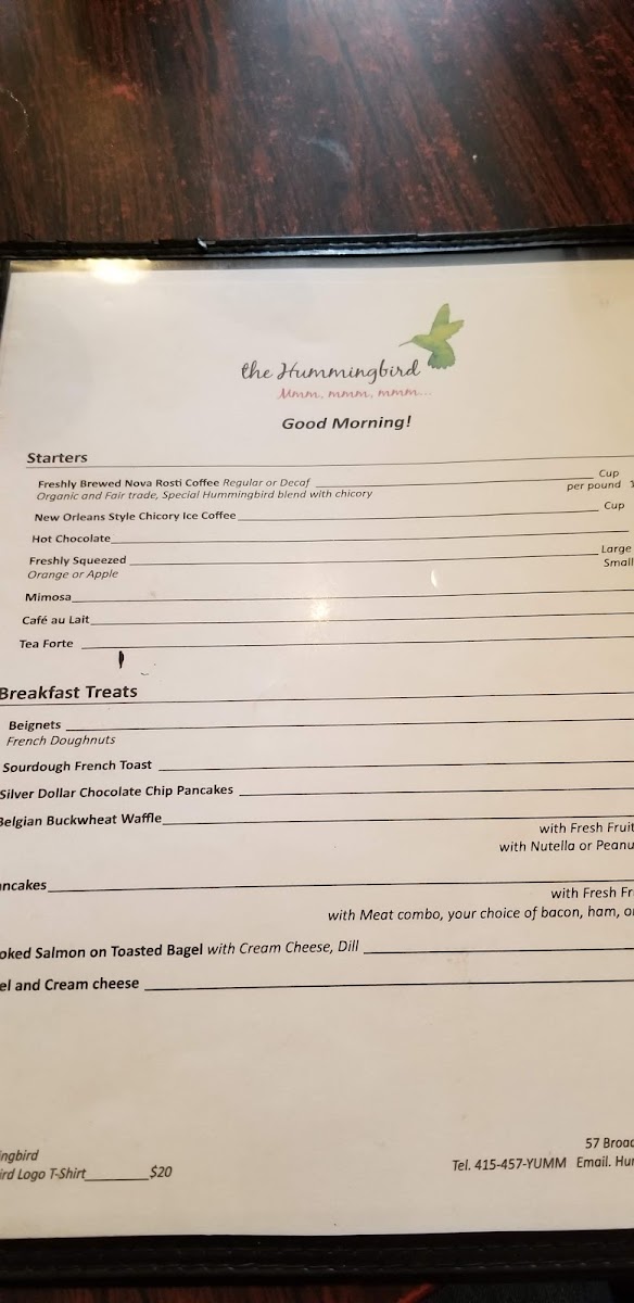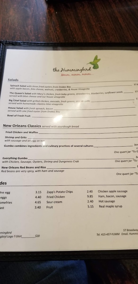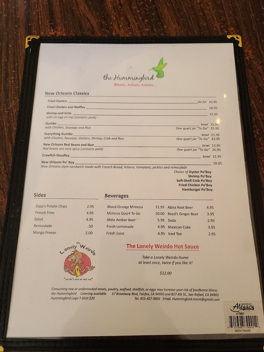 The menu at The Hummingbird in Fairfax, CA offers a diverse selection of Southern and Cajun-inspired dishes alongside classic American breakfast and brunch options. Guests can explore a variety of categories designed to suit different dining occasions, from morning meals and casual brunches to more substantial lunch plates.