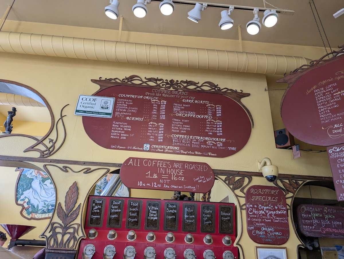 The beverage selection focuses strongly on coffee, with an extensive coffee-by-the-pound offering that includes single-origin beans (Colombia San Vicente, Ethiopia Kayon Mountain, Guatemala Huehuetenango) and blends like Commander’s Palace Coffee and Chicory or Premium New Orleans Dark Roast. Cold brew pods and decaffeinated options are also available.